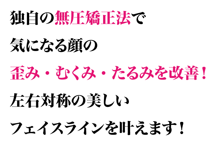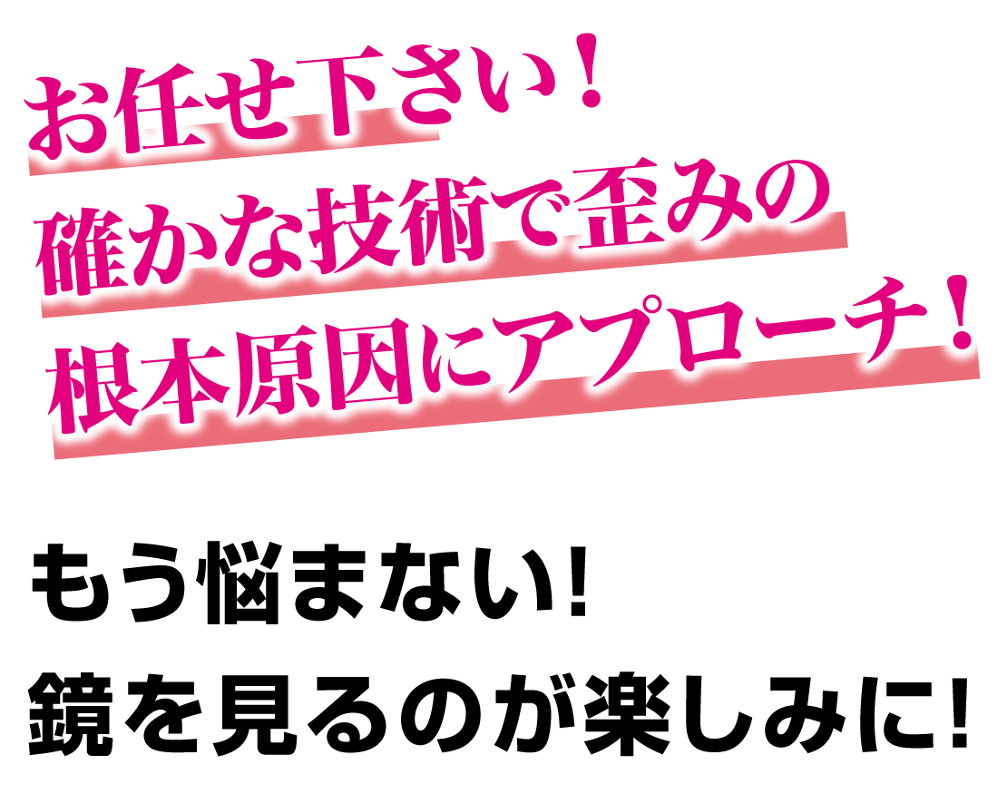 またお顔の歪みは身体の歪みの影響を受けてしまいますので最大限の効果を出すために首(頚椎)や骨盤などの歪みも同時に改善し、筋肉の不均衡を解消しながら徹底した美容矯正技術でお顔のシンメトリーを目指します。